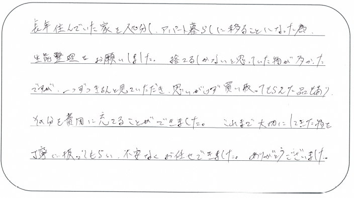 捨てるしかないと思っていた物が多かったですが、一つずつきちんと見ていただき、思いがけず買い取っていただいた品もあり、その分を費用に充てることができました。これまで大切にしてきた物を丁寧に扱ってもらい、不安なくお任せできました。ありがとうございました。