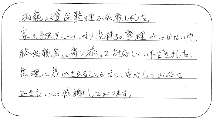 母が残した遺品が多く、どこから手をつければいいかわからず不安でしたが、i-storyさんが一つひとつ丁寧に扱ってくださり、しっかりと作業の説明をしていただけたので安心して任せることができました。